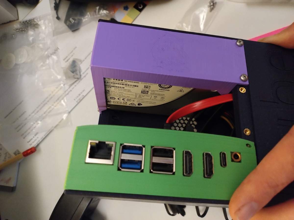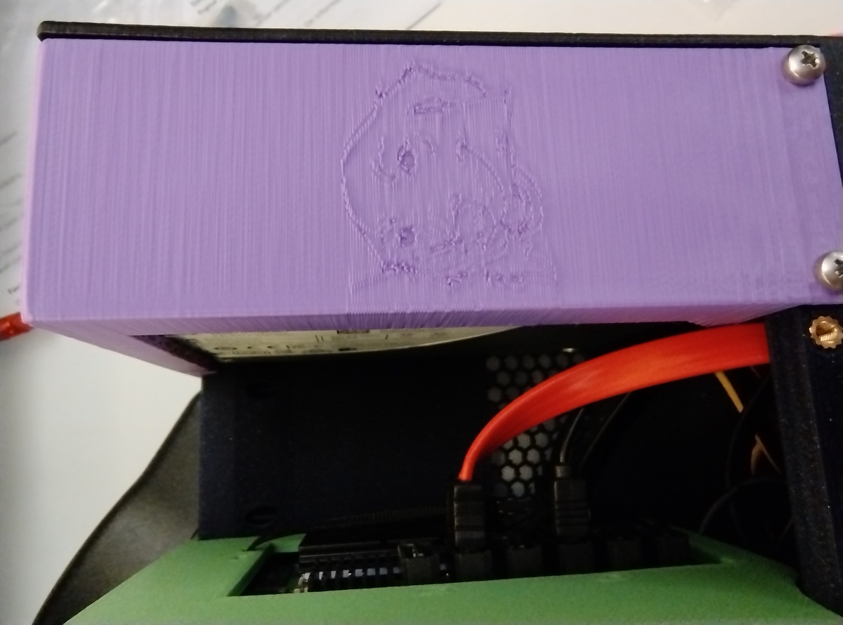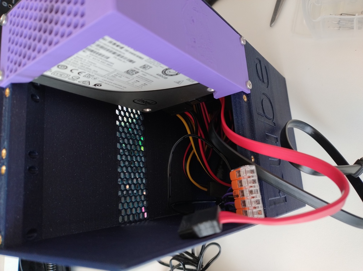 The SSD module was adorned with a picture of @uhthomas’ dog holding a 2.5" SATA SSD. It is thanks to Thomas that I was convinced to use power-loss protected enterprise SSDs and he also helped me find them. And the dog is how I know him, since that is his profile picture.