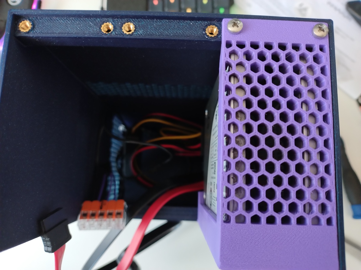 - At the bottom, there is enough space for the SATA data cables and the buck converter.
